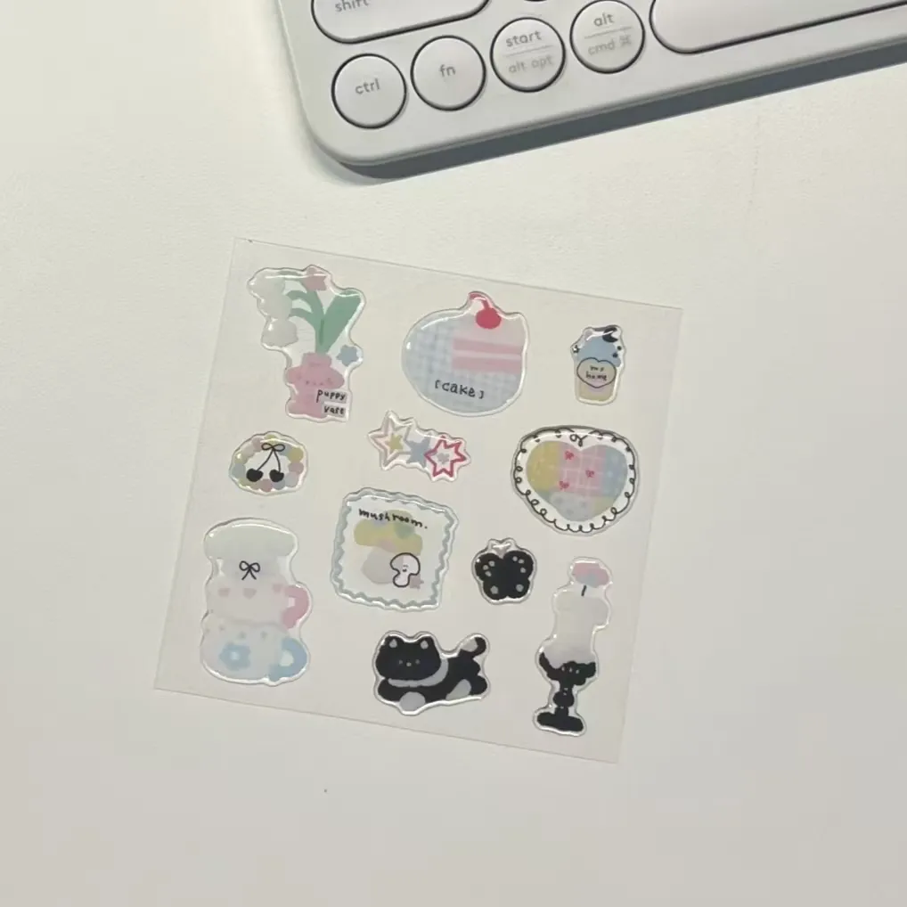Untuk pelekat resin epoksi kartun 3D, kami menawarkan bahan asas PVC/PP mesra alam. Ketebalan lapisan resin epoksi boleh disesuaikan dari 0.3mm hingga 1mm. Anda juga boleh memilih kesan bergemerlapan atau bercahaya untuk menambahkan lagi kreativiti pada pelekat. Kami menyediakan dua pilihan pelekat: pelekat kuat standard dan pelekat boleh tanggal bebas sisa, sesuai untuk melekat pada pelbagai permukaan seperti dinding, plastik, logam dan kertas.