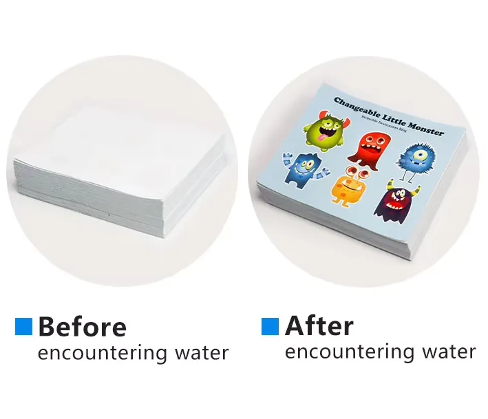 Apabila direndam dalam air, ia serta-merta bertukar menjadi keadaan seperti pes dan cepat tersebar. Warna yang dicetak padanya kemudian merebak dan berubah bentuk dengan sewajarnya. Proses perubahan warna tidak dapat dipulihkan. Setelah terdedah kepada air, ia akan memaparkan warna secara kekal.