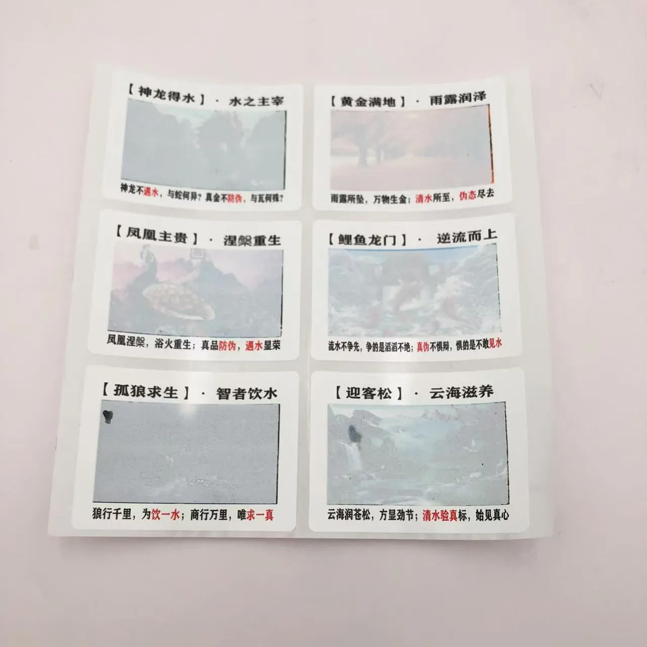 Label sensitif air perubahan warna menggunakan tindak balas fizikal atau kimia antara dakwat dan air untuk menjadikan corak tersembunyi kelihatan atau mencetuskan perubahan warna. Dihasilkan dengan proses dan peralatan khusus, label ini menawarkan ciri anti-pemalsuan yang sangat baik. Selepas pengeringan, jenis tertentu boleh kembali kepada keadaan asalnya, membolehkan penggunaan berulang.