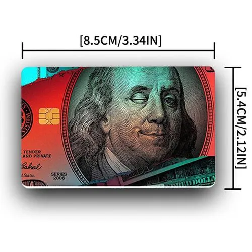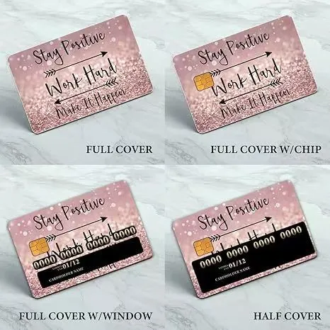 Pelekat kad kreditDatang dalam pelbagai gaya, termasuk penutup penuh, penutup separuh, tutup dengan tetingkap untuk nombor kad atau cip, dan tutup dengan kawasan pra-potong untuk microchip. Saiz biasanya direka untuk menyesuaikan kad kredit bersaiz standard, kira -kira 5.3*8.5cm.