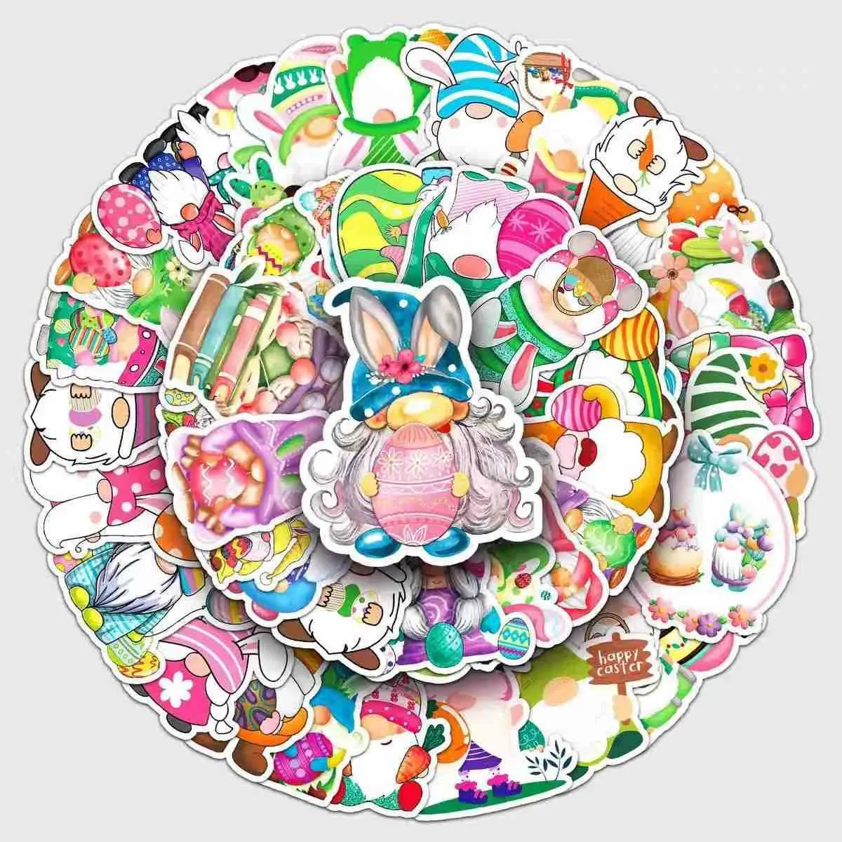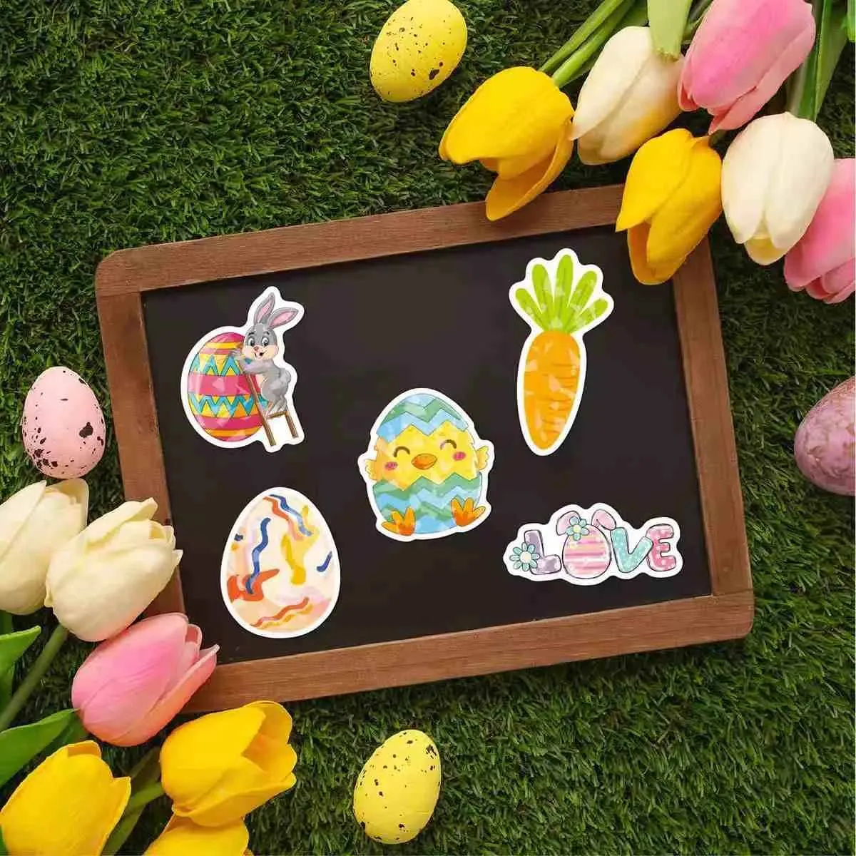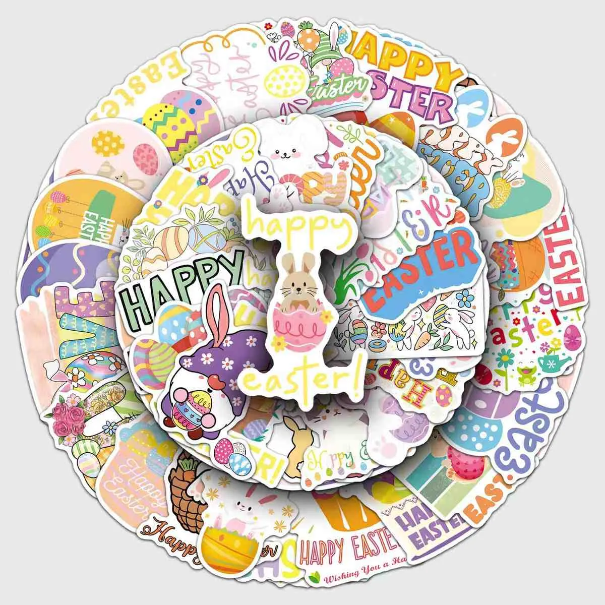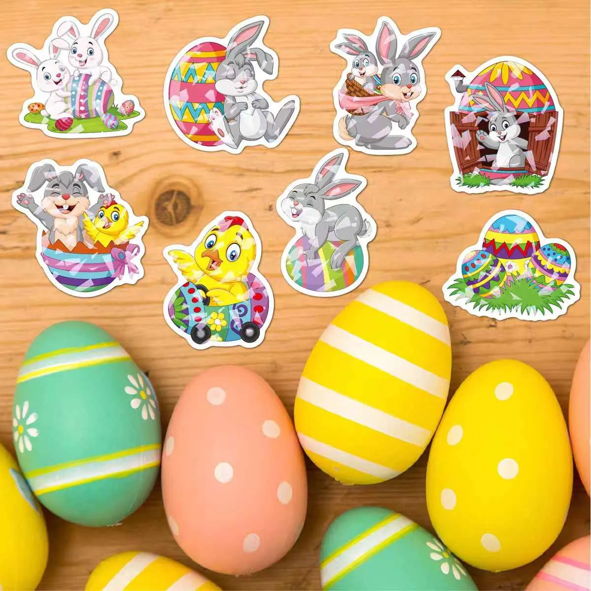 Sesuai untuk pelbagai kegunaan Paskah: Pelekat kecil untuk telur atau cengkerang coklat, sederhana untuk kotak hadiah dan bakul, dan besar untuk memaparkan tingkap. Membuang dengan mudah tanpa residu dari permukaan seperti kaca, plastik, atau kayu.