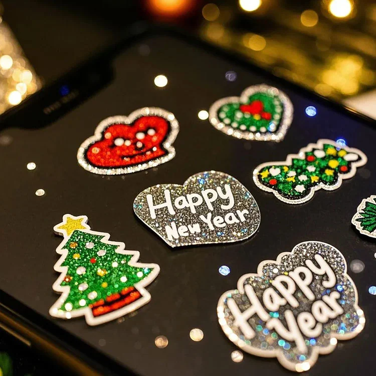 1. Penyesuaian yang diperibadikan:Kami boleh menyesuaikan pelekat glitter mengikut keperluan khusus pembeli. Anda boleh memberikan saiz, warna, bahan, corak yang diperlukan, kami akan menyesuaikan reka bentuk dan pengeluaran.