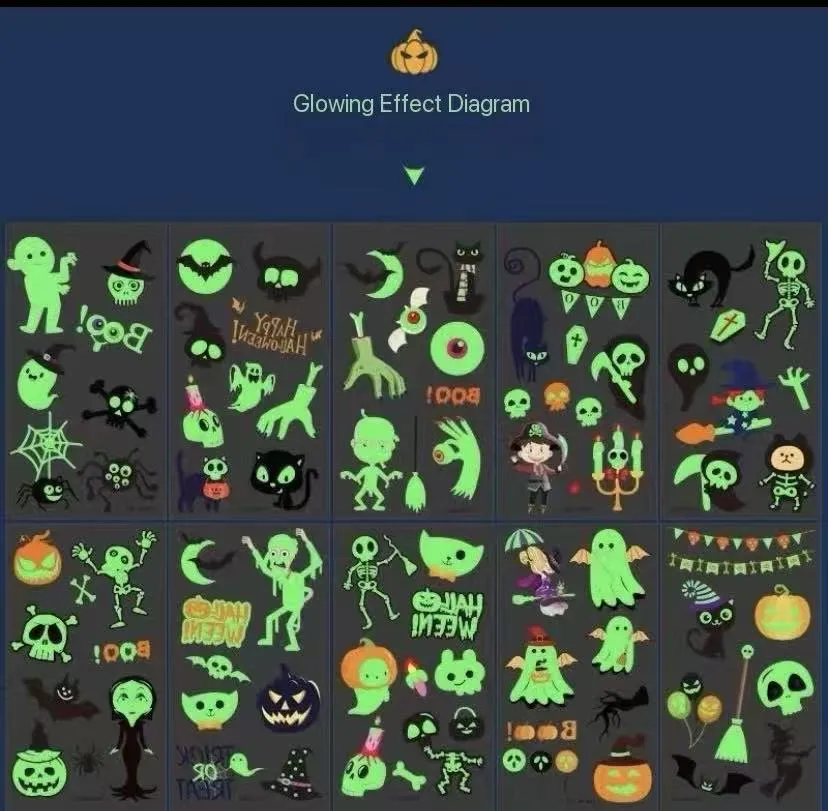 Halloween Night Glow Tattoo Stickers adalah item hiasan kreatif yang direka khas untuk perayaan Halloween. Ia diperbuat daripada bahan dakwat bersinar yang mesra alam dan menggabungkan reka bentuk corak tatu yang bergaya. Pada siang hari, ia boleh membentangkan warna semulajadi atau kesan tatu hitam, dan pada waktu malam, ia boleh memancarkan cahaya pendarfluor yang sejuk, membolehkan anda menjadi pusat perhatian di pesta Halloween, parade jalanan, dan acara bertema. Sama ada anda mencari reka bentuk hantu yang menyeramkan dan unik atau lebih suka suasana gelap misteri dan romantis, anda boleh mencari pilihan kegemaran anda di antara pelbagai corak yang kaya. Anda boleh menikmati pakaian bertemakan Halloween yang menarik tanpa mengalami kesakitan dan ketahanan tatu.