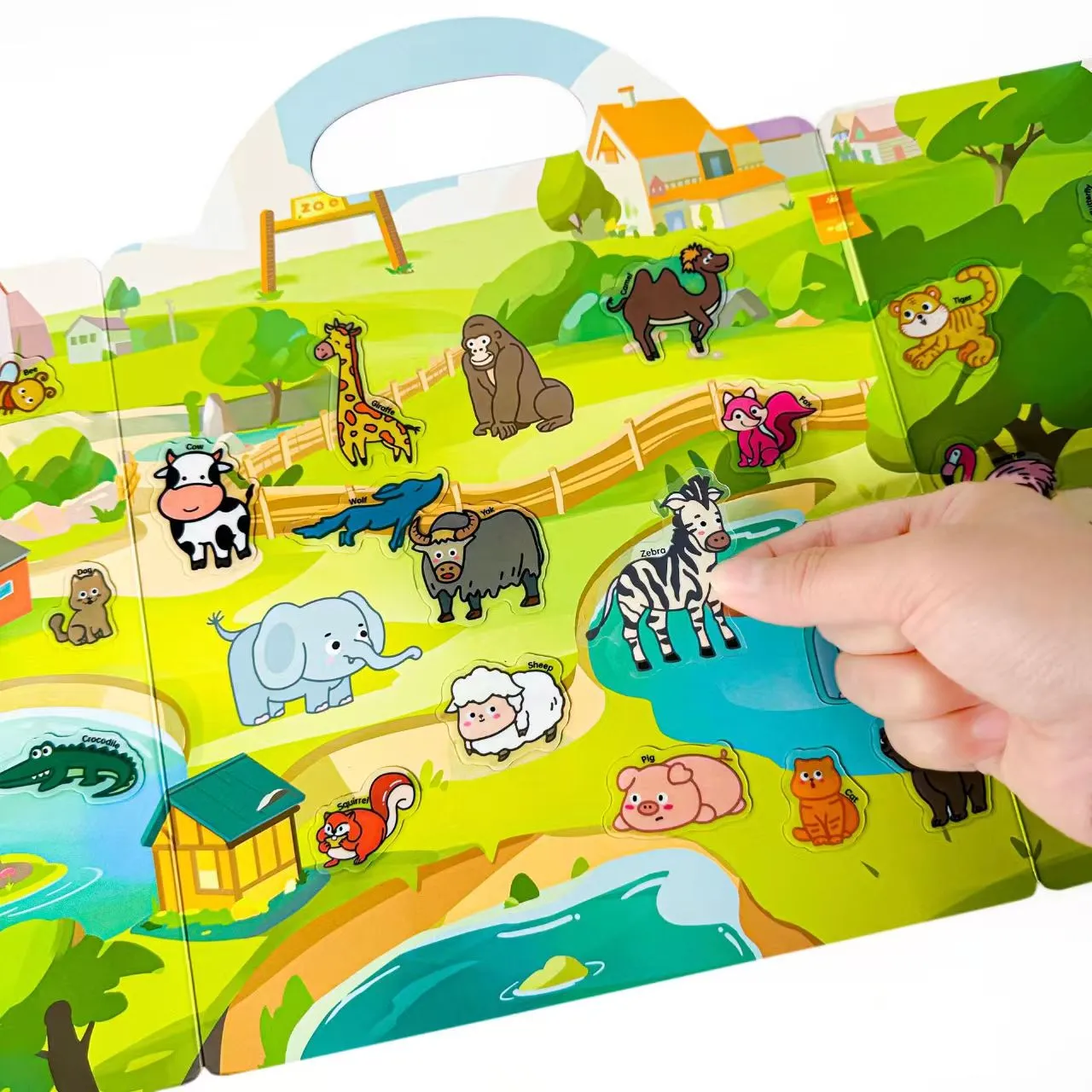 Set ini termasuk buku adegan mesra alam waterproof + pelekat jeli yang boleh diguna semula yang diperbuat daripada bahan-bahan yang tidak beracun, tahan air mata yang mematuhi piawaian keselamatan kanak-kanak. Kedua-dua buku dan pelekat dicetak dengan dakwat kacang soya eco dan pelekat berkualiti tinggi, memastikan ketahanan dan tanggungjawab alam sekitar.