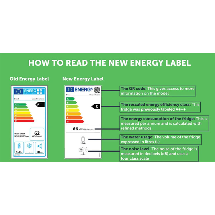 Label kecekapan tenaga peti sejukialah papan tanda, biasanya diperbuat daripada bahan tahan lasak, dengan warna dan grafik tersendiri untuk pengecaman mudah.Label kecekapan tenaga peti sejukmengandungi ikon tahap kecekapan tenaga, biasanya menggunakan sistem penarafan huruf atau bintang, untuk menunjukkan dengan jelas prestasi penggunaan tenaga peti sejuk.