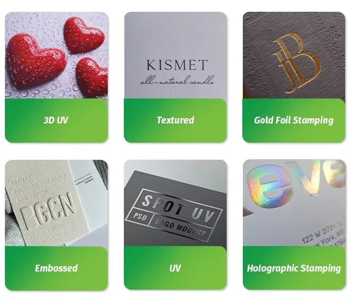 Embossing: Mencipta corak atau teks tiga dimensi yang dibangkitkan pada label lilin wangi. Ia menambah tekstur dan elemen sentuhan, menjadikan label lilin wangi lebih menarik untuk disentuh. Embossing berfungsi dengan baik dengan logo atau motif hiasan, meningkatkan rasa premium.