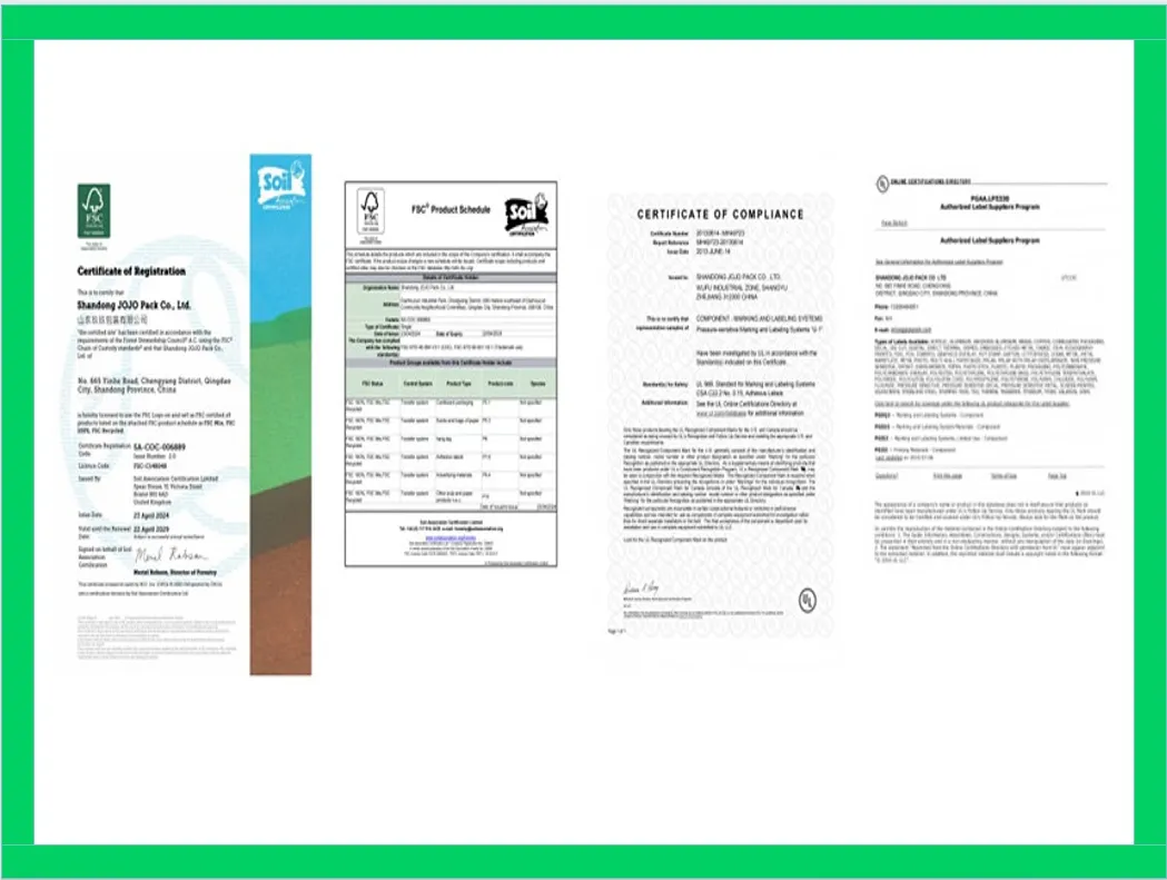 Produk JoJo Pack telah memperoleh pensijilan FSC dan UL, dan piawaian pengeluaran label sepenuhnya selaras dengan piawaian antarabangsa. Kami mempunyai pasukan selepas jualan profesional yang bertanggungjawab untuk pengangkutan produk, perkhidmatan selepas jualan dan maklum balas pelanggan, Jojo Pack berharap untuk memenangi kepercayaan anda dengan produk dan perkhidmatan yang berkualiti tinggi, membantu produk anda lebih kompetitif dan mencapai kerjasama menang-menang.
